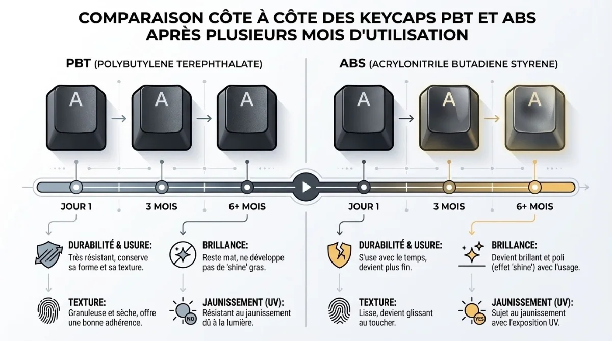 Notre conseil sur le prix : investissez dans un bon set de keycaps PBT plutôt que d'acheter plusieurs sets de touches ABS qui s'useront vite. Sur le long terme, le choix premium de keycaps revient moins cher en prix et offre une meilleure sensation au quotidien sur vos touches de claviers mécaniques. Consultez notre guide sur les switches de clavier mécanique pour optimiser l'ensemble de votre configuration de keycaps.