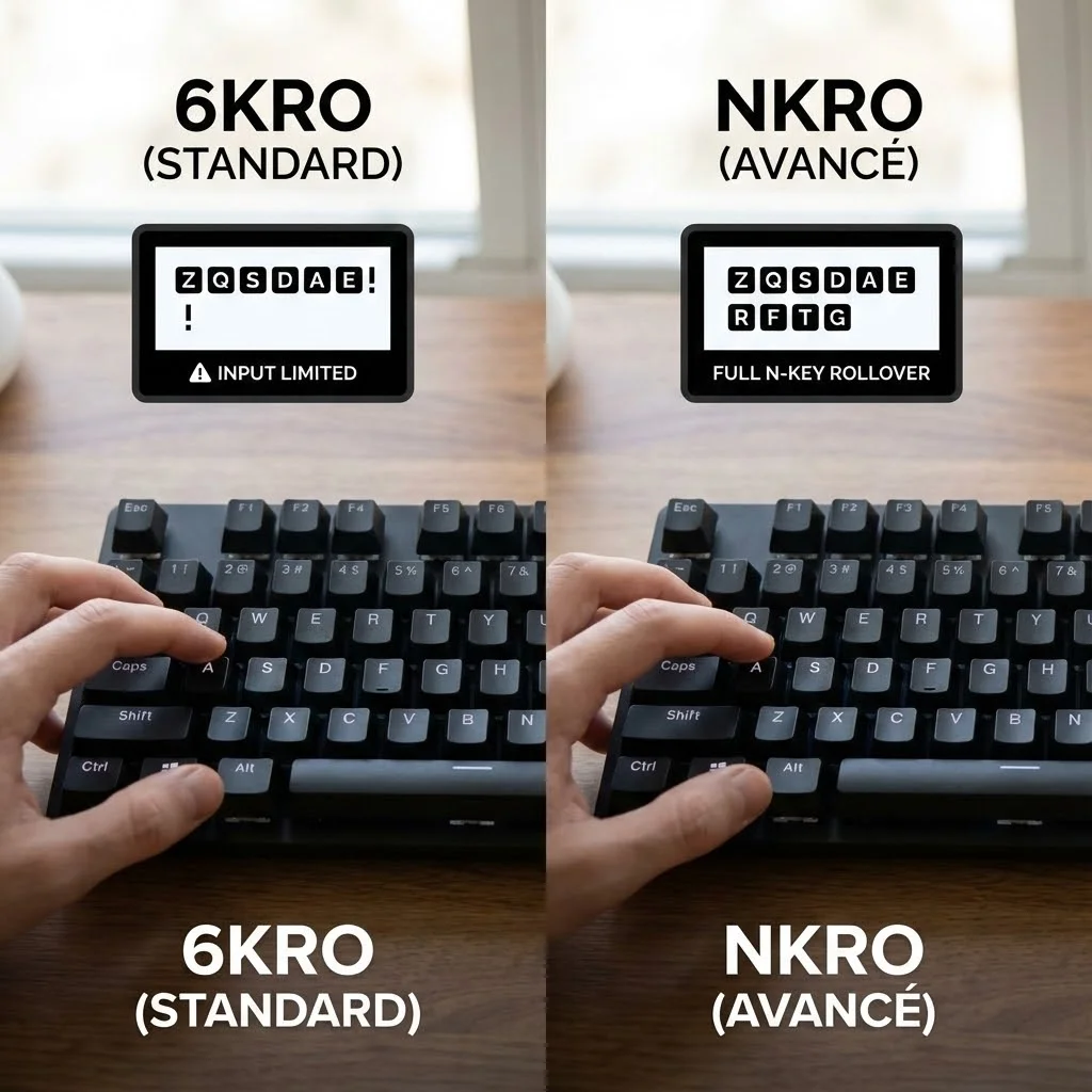 Concrètement, imagine que tu joues à un FPS et que tu maintiens W + A + Shift pour courir en diagonale tout en pressant Espace pour sauter. Un clavier sans cette technologie risque d'ignorer une pression, voire d'enregistrer une frappe fantôme que tu n'as jamais effectuée.