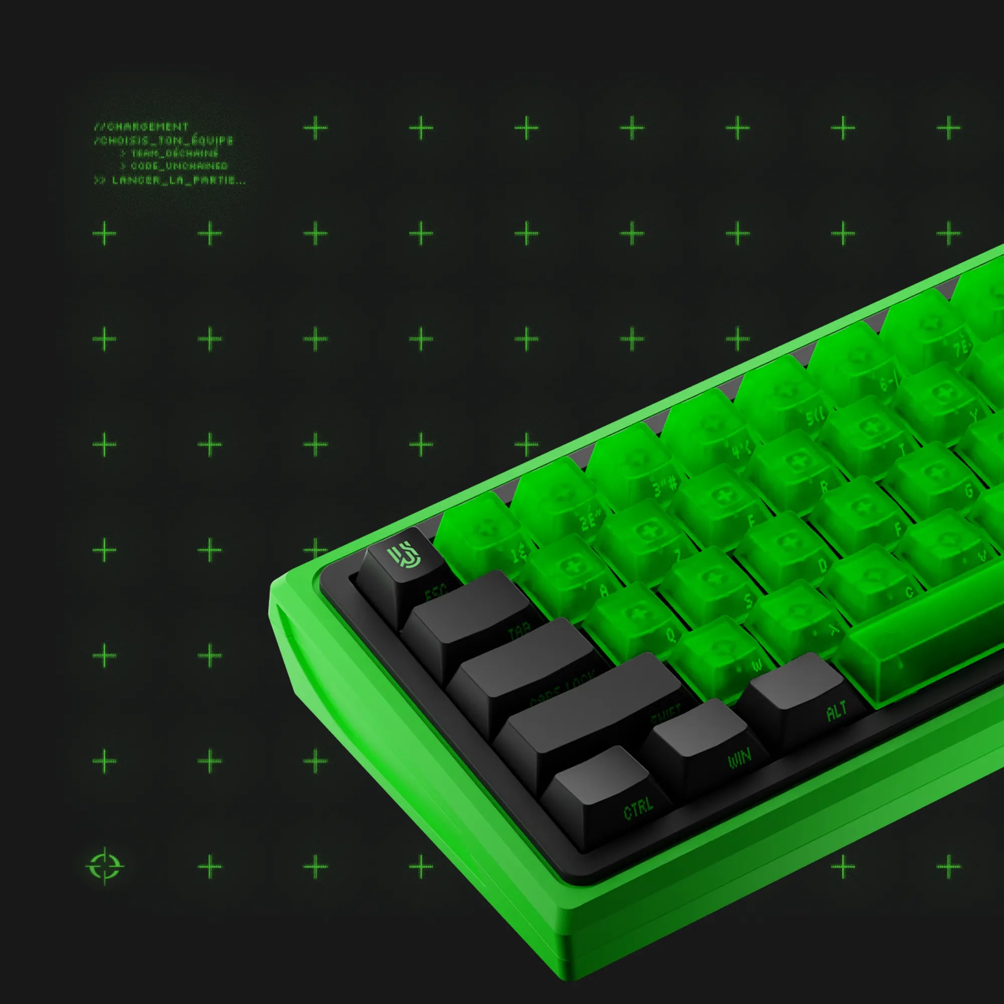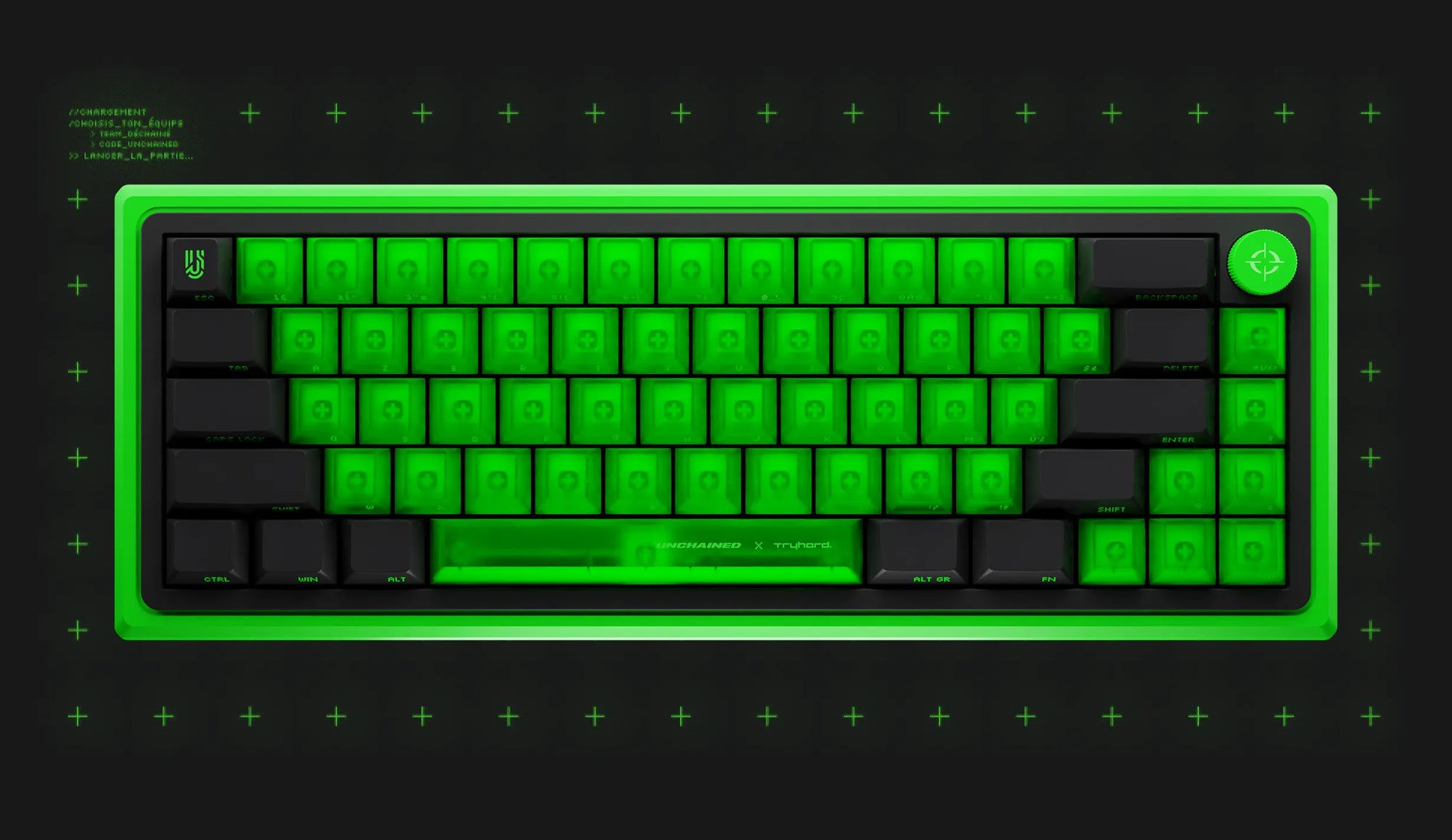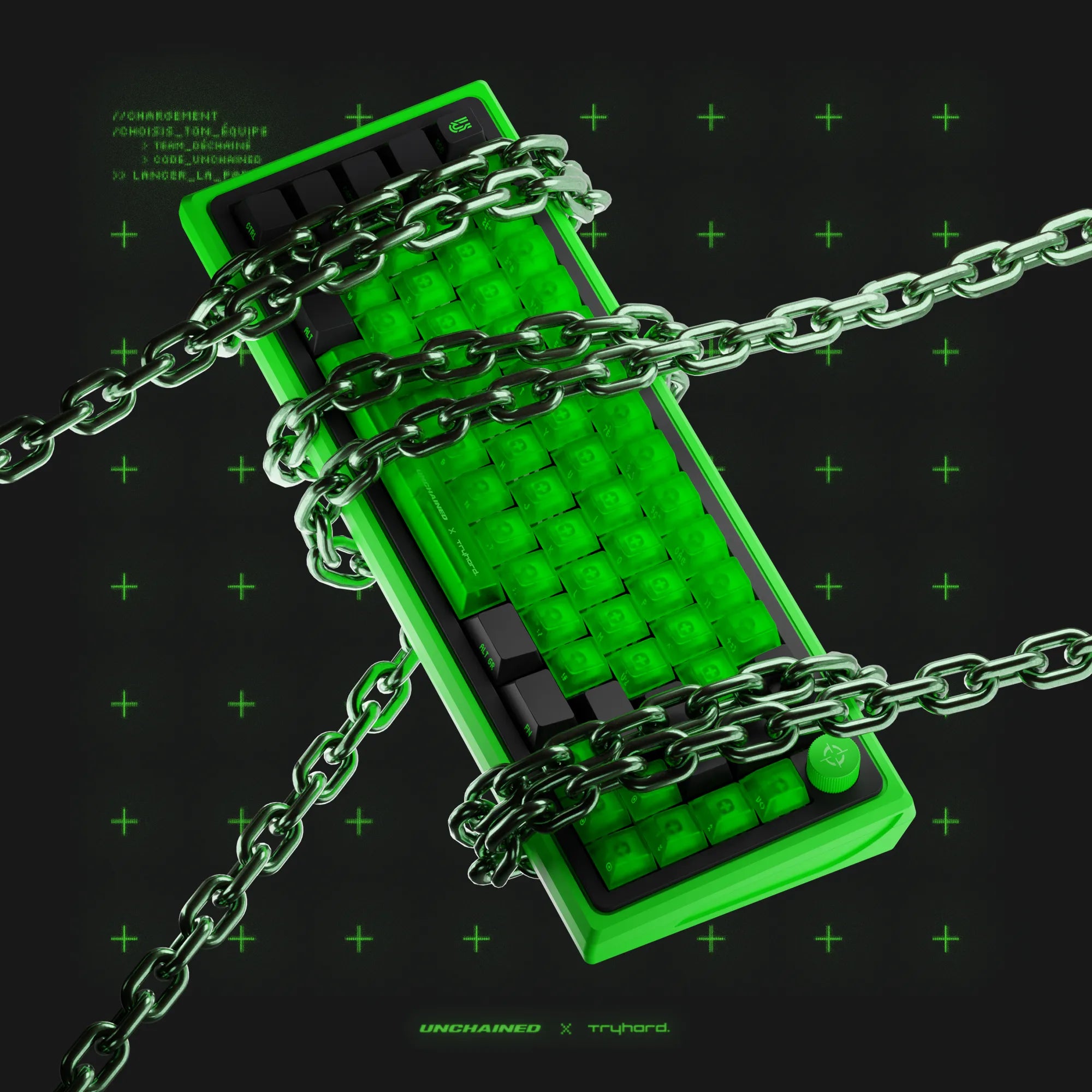 En collaboration avec le créateur de contenu Unchained. Prônant la performance et la rigueur, le vidéaste souhaitait un clavier à son image. Ce clavier ne se contente pas d’être esthétique : il offre une sensation de frappe douce et équilibrée, associant confort et réactivité pour une expérience d’écriture et de jeu à la fois fluide et agréable. Conçu dans un format ANSI en AZERTY, spécialement pensé pour le marché français, il allie esthétisme et confort d’utilisation au quotidien.